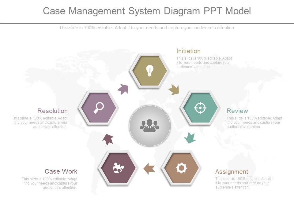 This is a case management system diagram ppt model. This is a five stage process. The stages in this process are initiation, review, assignment, case work, resolution.