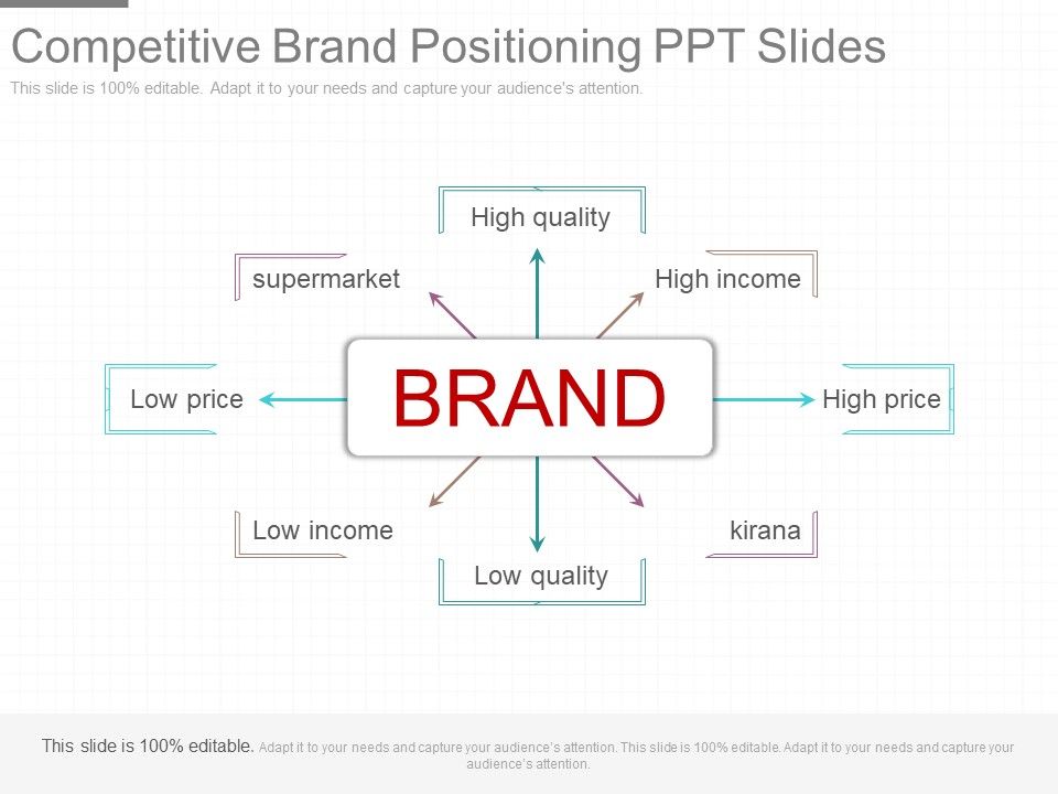 This is a competitive brand positioning ppt slides. This is a eight stage process. The stages in this process are high quality, high income, high price, kirana, low quality, low income, low price, supermarket.