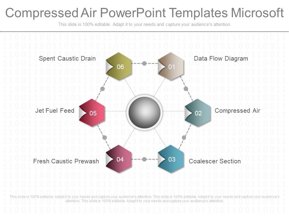 This is a compressed air powerpoint templates microsoft. This is a six stage process. The stages in this process are data flow diagram, compressed air, coalescer section, fresh caustic prewash, jet fuel feed, spent caustic drain.