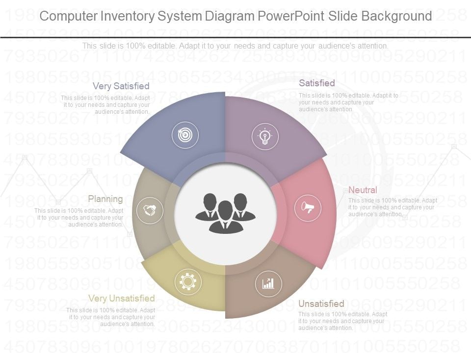 This is a computer inventory system diagram powerpoint slide background. This is a six stage process. The stages in this process are satisfied, neutral, unsatisfied, very unsatisfied, planning, very satisfied.