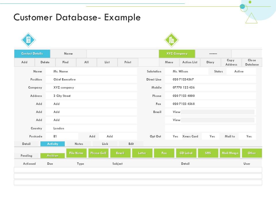 Deliver and pitch your topic in the best possible manner with this customer database example customer relationship management crm sample pdf. Use them to share invaluable insights on customer database example and impress your audience. This template can be altered and modified as per your expectations. So, grab it now.