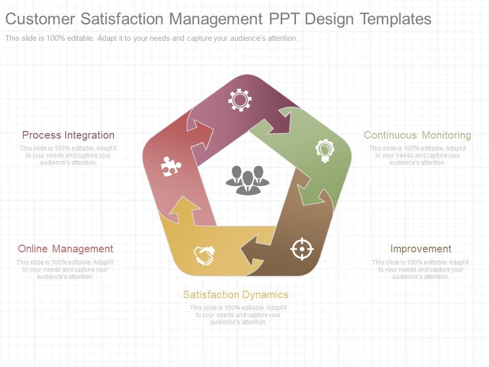 This is a customer satisfaction management ppt design templates. This is a five stage process. The stages in this process are process integration, online management, satisfaction dynamics, continuous monitoring, improvement.