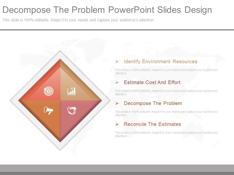 This is a decompose the problem powerpoint slides design. This is a four stage process. The stages in this process are identify environment resources, estimate cost and effort, decompose the problem, reconcile the estimates.