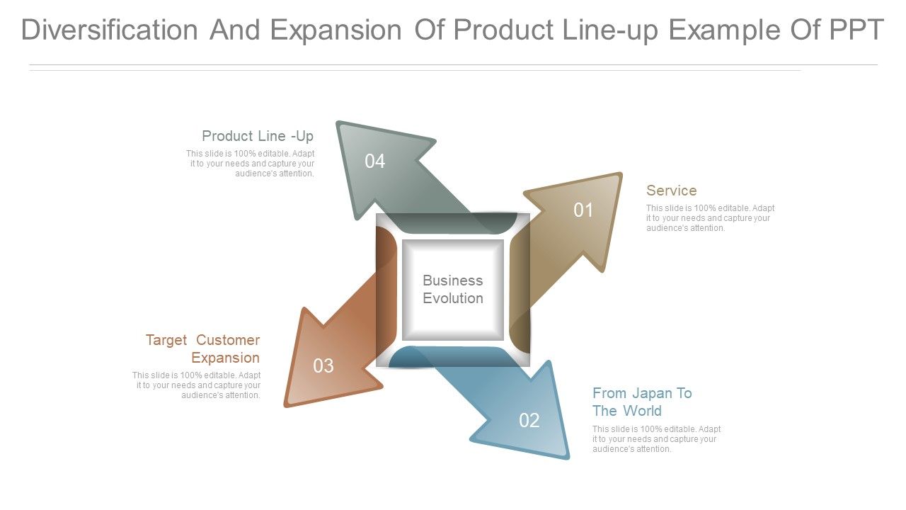 This is a diversification and expansion of product line up example of ppt. This is a four stage process. The stages in this process are business evolution, product line up, target customer, service, from japan to the world.