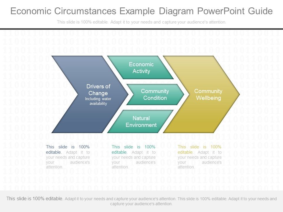 This is a economic circumstances example diagram powerpoint guide. This is a three stage process. The stages in this process are drivers of change including water availability, economic activity, community condition, natural environment, community wellbeing.