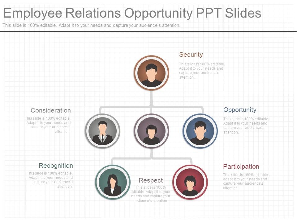 This is a employee relations opportunity ppt slides. This is a six stage process. The stages in this process are participation, opportunity, participation, consideration, recognition, respect.