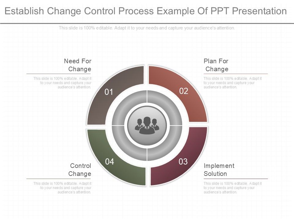 This is a establish change control process example of ppt presentation. This is a four stage process. The stages in this process are need for change, control change, plan for change, implement solution.