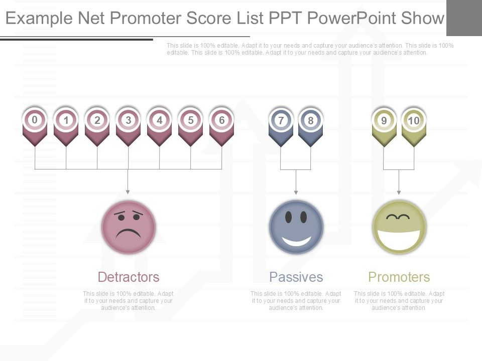 This is a example net promoter score list ppt powerpoint show. This is a three stage process. The stages in this process are detractors, passives, promoters.