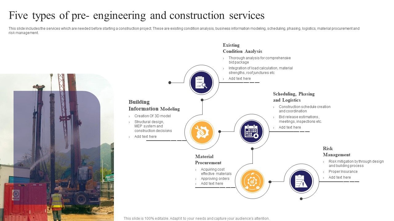 This slide includes the services which are needed before starting a construction project. These are existing condition analysis, business information modeling, scheduling, phasing, logistics, material procurement and risk management. Presenting Five Types Of Pre Engineering And Construction Services Ppt PowerPoint Presentation Outline Example Introduction PDF to dispense important information. This template comprises five stages. It also presents valuable insights into the topics including Information Modeling, Scheduling Phasing, Risk Management. This is a completely customizable PowerPoint theme that can be put to use immediately. So, download it and address the topic impactfully.