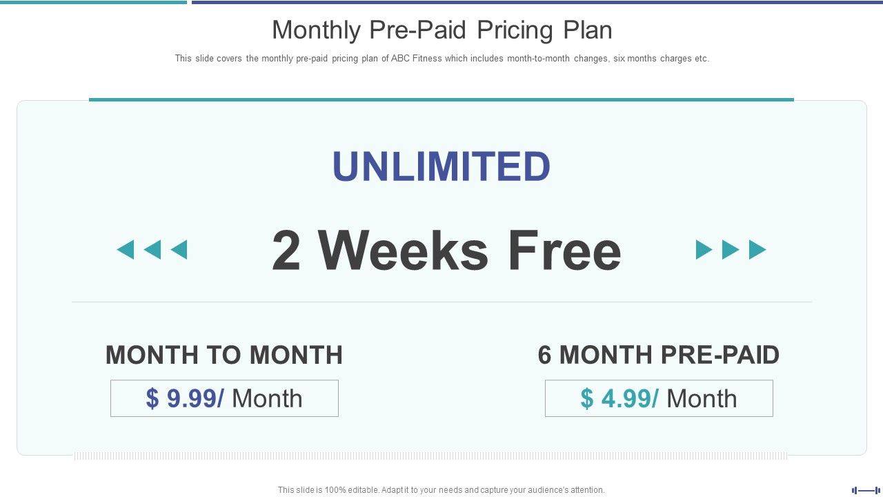 This slide covers the monthly pre-paid pricing plan of ABC Fitness which includes month to month changes, six months charges etc.Deliver and pitch your topic in the best possible manner with this Fundraising Pitch Deck For Gym Startup Monthly Pre Paid Pricing Plan Graphics PDF Use them to share invaluable insights on Pre Paid, Pricing Plan and impress your audience. This template can be altered and modified as per your expectations. So, grab it now.