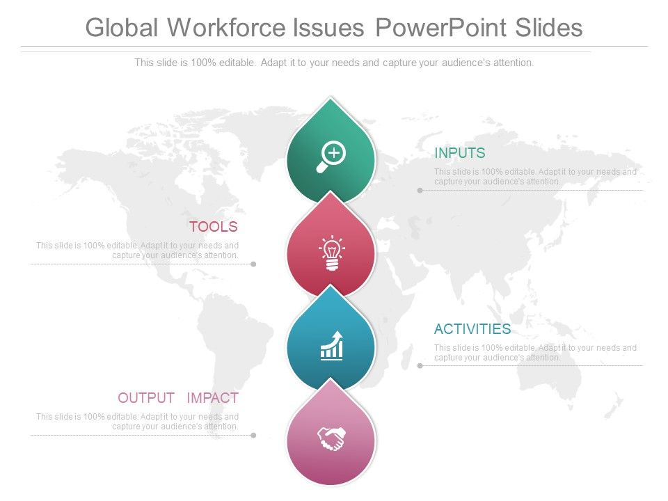 This is a global workforce issues powerpoint slides. This is a four stage process. The stages in this process are tools, output impact , inputs, activities.