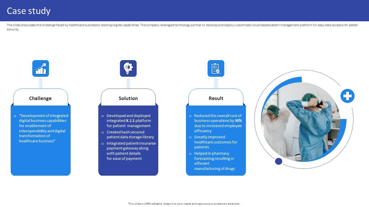 The slide showcases the challenge faced by healthcare business to develop digital capabilities. The company leveraged technology partner to develop and deploy customized cloud-based patient management platform for easy data access with added security. Deliver an awe inspiring pitch with this creative Hospital Medical Research Company Profile Case Study Ppt Pictures Rules PDF bundle. Topics like Challenge, Solution, Developed And Deployed can be discussed with this completely editable template. It is available for immediate download depending on the needs and requirements of the user.