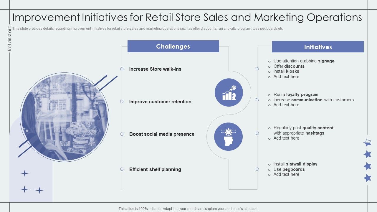 This slide provides details regarding improvement initiatives for retail store sales and marketing operations such as offer discounts, run a loyalty program. Use pegboards etc.Deliver and pitch your topic in the best possible manner with this Improvement Initiatives For Retail Store Sales And Marketing Operations Slide Retail Outlet Performance Assessment Elements PDF. Use them to share invaluable insights on Improve Customer, Media Presence, Increase Communication and impress your audience. This template can be altered and modified as per your expectations. So, grab it now.