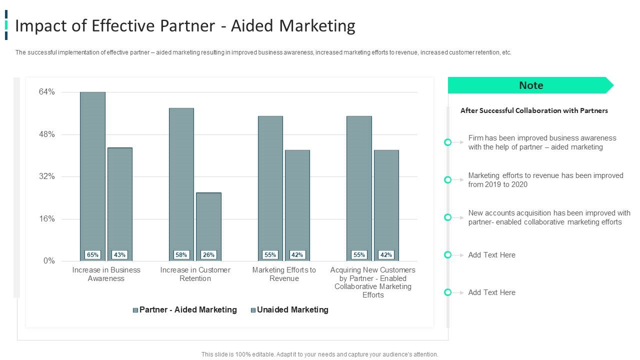 The successful implementation of effective partner aided marketing resulting in improved business awareness, increased marketing efforts to revenue, increased customer retention, etc. Deliver an awe inspiring pitch with this creative improving brand awareness through wom marketing impact of effective partner aided marketing clipart pdf bundle. Topics like impact of effective partner aided marketing can be discussed with this completely editable template. It is available for immediate download depending on the needs and requirements of the user.