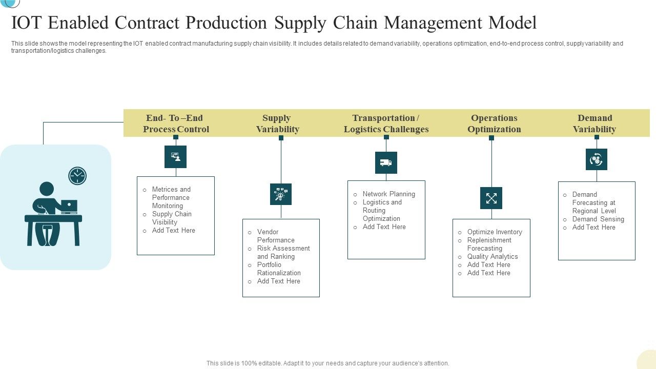 This slide shows the model representing the IOT enabled contract manufacturing supply chain visibility. It includes details related to demand variability, operations optimization, end to end process control, supply variability and transportation logistics challenges. Persuade your audience using this IOT Enabled Contract Production Supply Chain Management Model Diagrams PDF. This PPT design covers Five stages, thus making it a great tool to use. It also caters to a variety of topics including Supply Variability, Transportation, Logistics Challenges. Download this PPT design now to present a convincing pitch that not only emphasizes the topic but also showcases your presentation skills.
