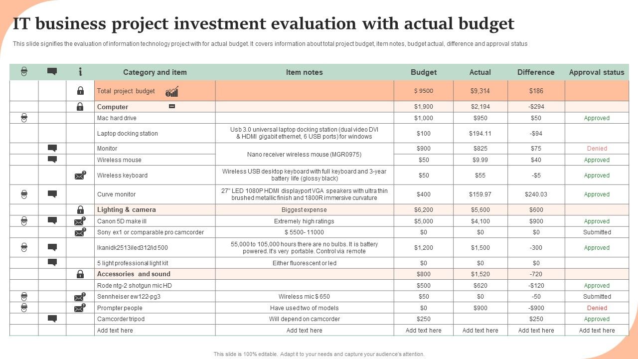 This slide signifies the evaluation of information technology project with for actual budget. It covers information about total project budget, item notes, budget actual, difference and approval status. Showcasing this set of slides titled IT Business Project Investment Evaluation With Actual Budget Ideas PDF. The topics addressed in these templates are Category And Item, Approval Status, Actual. All the content presented in this PPT design is completely editable. Download it and make adjustments in color, background, font etc. as per your unique business setting.