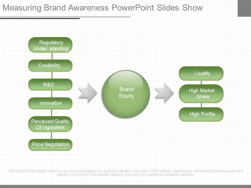 This is a measuring brand awareness powerpoint slides show. This is a ten stage process. The stages in this process are credibility, innovation, price negotiation, loyalty, high profits, brand equity, regulatory under standing.