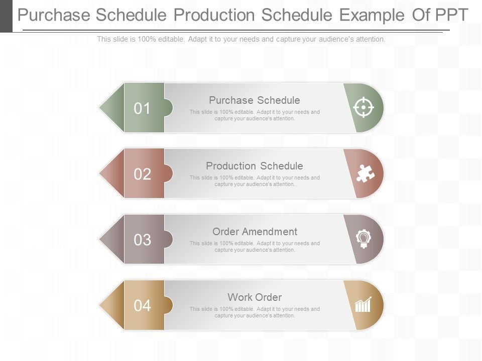 This is a purchase schedule production schedule example of ppt. This is a four stage process. The stages in this process are purchase schedule, production schedule, order amendment, work order.