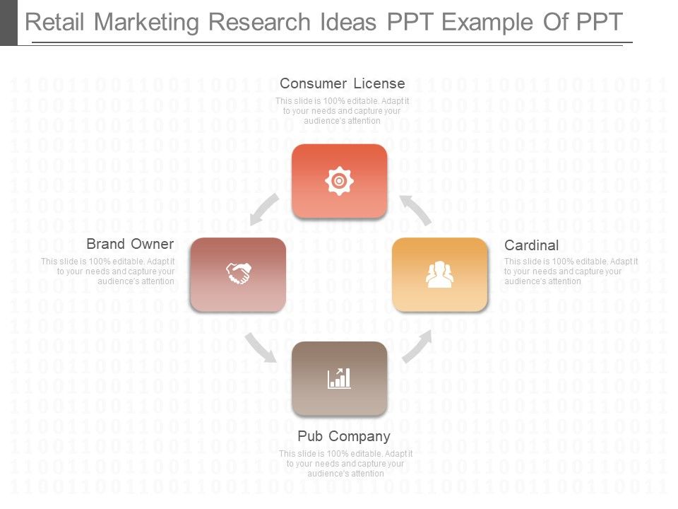 This is a retail marketing research ideas ppt example of ppt. This is a four stage process. The stages in this process are consumer license, cardinal, pub company, brand owner.