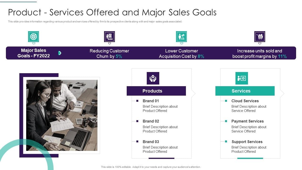 This slide provides information regarding various product and services offered by firm to its prospective clients along with and major sales goals associated. Presenting sales techniques playbook product services offered and major sales goals mockup pdf to provide visual cues and insights. Share and navigate important information on four stages that need your due attention. This template can be used to pitch topics like reducing customer, lower customer acquisition, increase units sold In addtion, this PPT design contains high resolution images, graphics, etc, that are easily editable and available for immediate download.