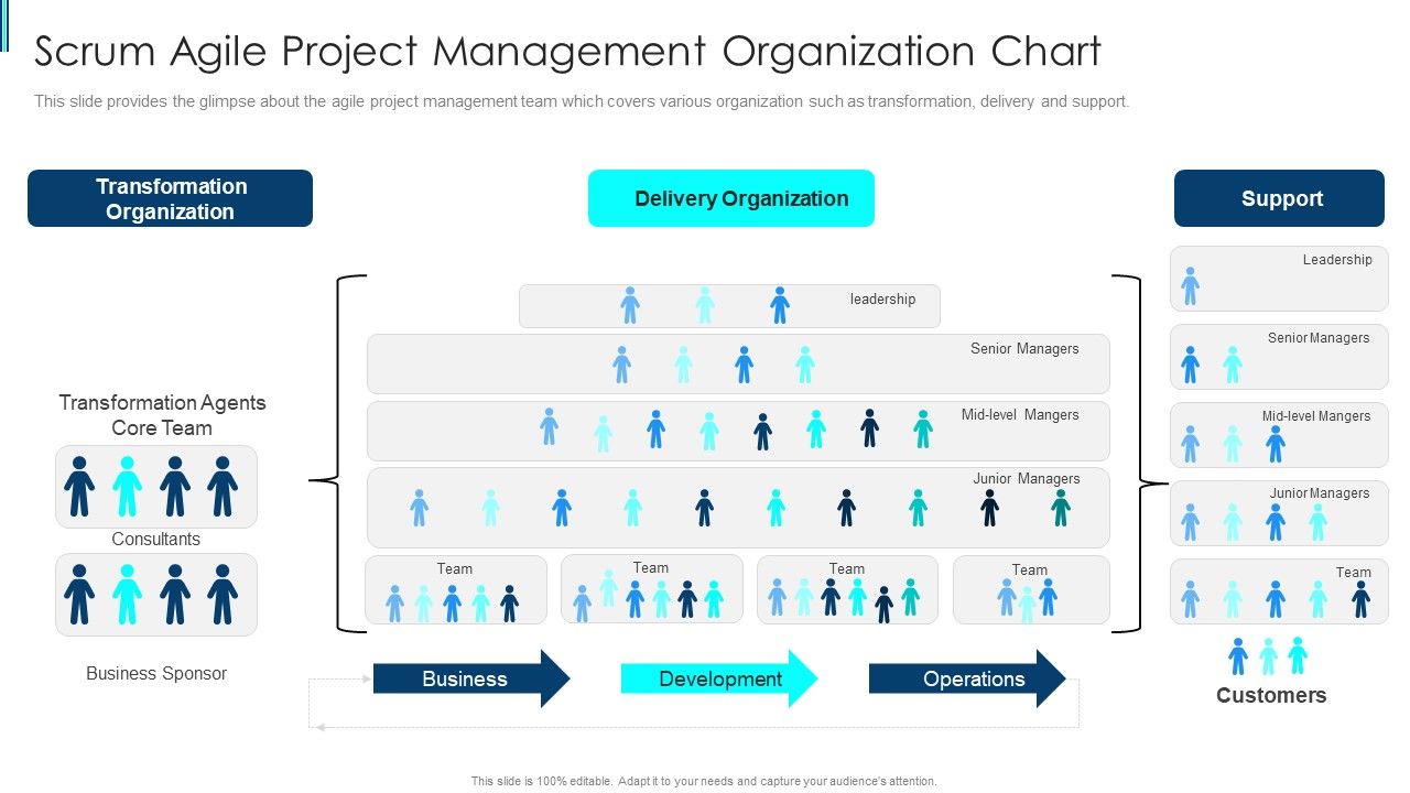 This slide provides the glimpse about the agile project management team which covers various organization such as transformation, delivery and support. Deliver an awe inspiring pitch with this creative scrum staff organization map it scrum agile project management organization chart pictures pdf bundle. Topics like team, business, development, delivery organization can be discussed with this completely editable template. It is available for immediate download depending on the needs and requirements of the user.