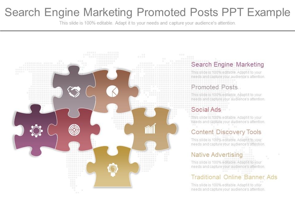 This is a search engine marketing promoted posts ppt example. This is a six stage process. The stages in this process are search engine marketing, promoted posts, social ads, content discovery tools, native advertising, traditional online banner ads.