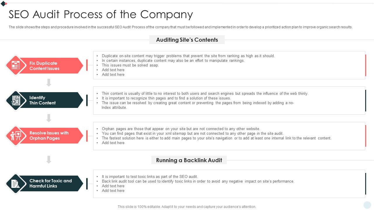 The slide shows the steps and procedure involved in the successful SEO Audit Process of the company that must be followed and implemented in order to develop a prioritized action plan to improve organic search results. Presenting SEO Audit Summary To Increase SEO Audit Process Of The Company Background PDF to provide visual cues and insights. Share and navigate important information on four stages that need your due attention. This template can be used to pitch topics like Identify Thin Content, Resolve Issues, Relevant Content. In addtion, this PPT design contains high resolution images, graphics, etc, that are easily editable and available for immediate download.