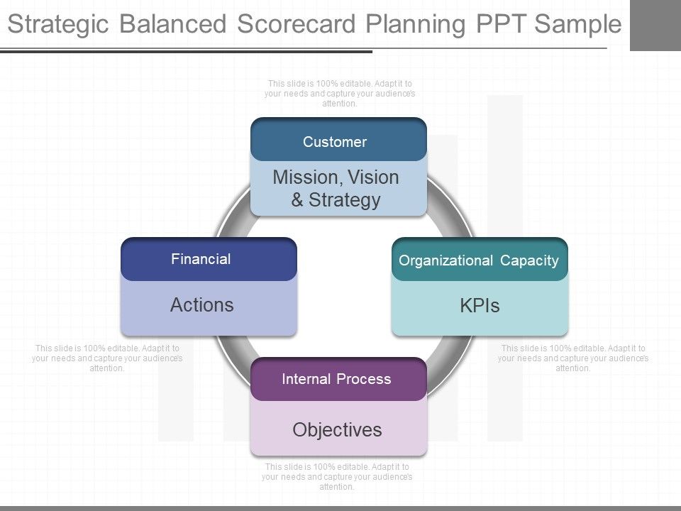 This is a strategic balanced scorecard planning ppt sample. This is a four stage process. The stages in this process are customer mission, vision and strategy, financial actions, internal process objectives, organizational capacity kpis.
