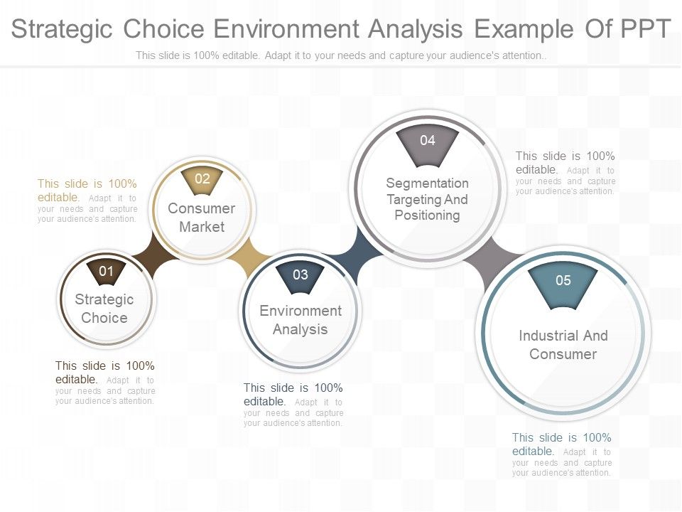 This is a strategic choice environment analysis example of ppt. This is a five stage process. The stages in this process are strategic choice, consumer market, environment analysis, segmentation targeting and positioning, industrial and consumer.