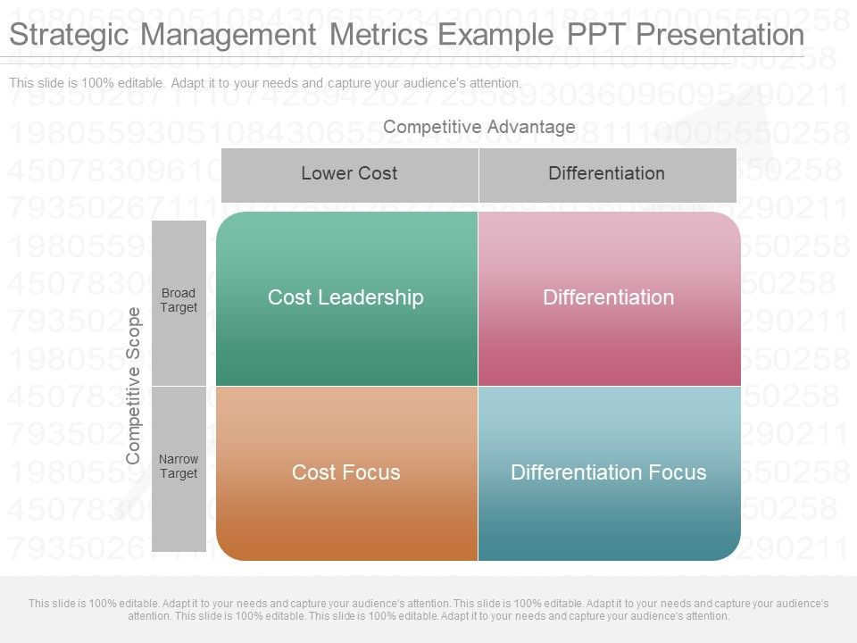 This is a strategic management metrics example ppt presentation. This is a four stage process. The stages in this process are lower cost, differentiation, broad target, narrow target, cost leadership, differentiation, cost focus, differentiation focus.