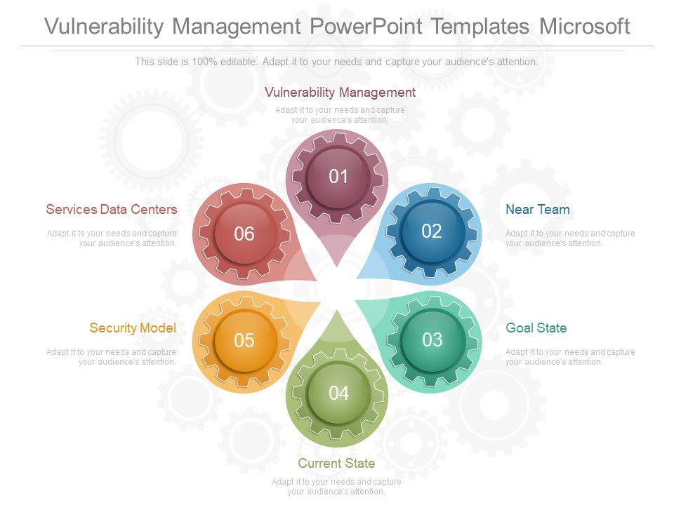 This is a vulnerability management powerpoint templates microsoft. This is a six stage process. The stages in this process are vulnerability management, services data centers, security model, current state, goal state, near team.