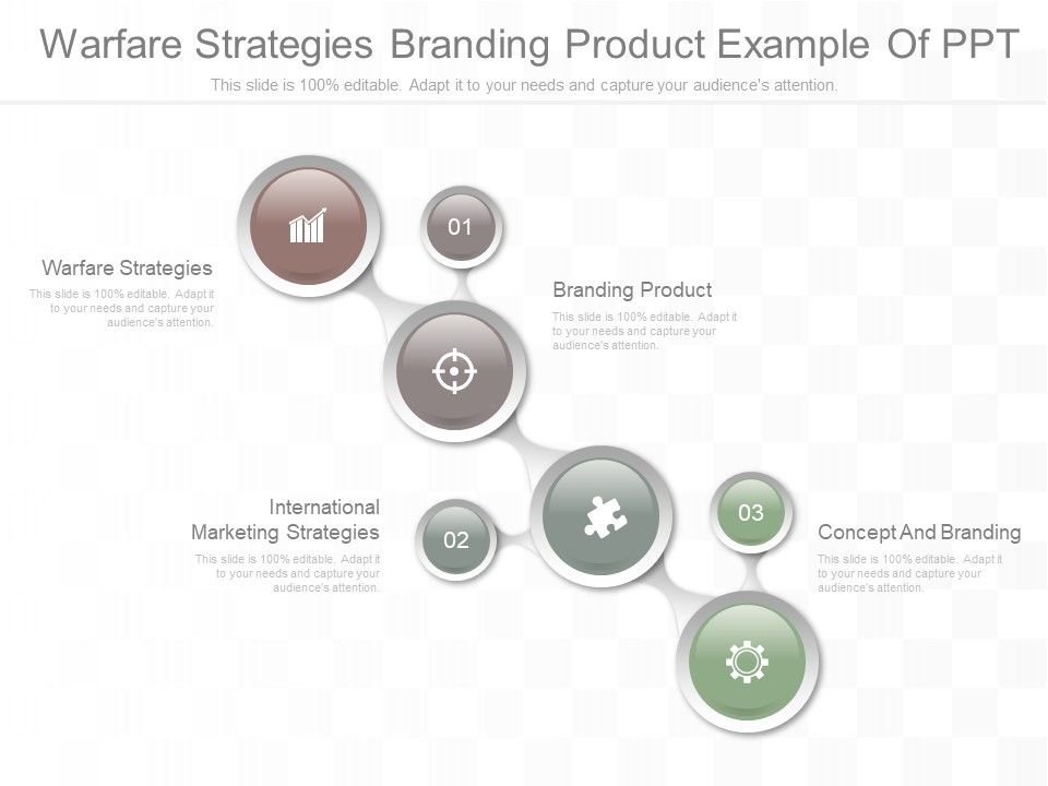 This is a warfare strategies branding product example of ppt. This is a three stage process. The stages in this process are warfare strategies, branding product, international marketing strategies, concept and branding.