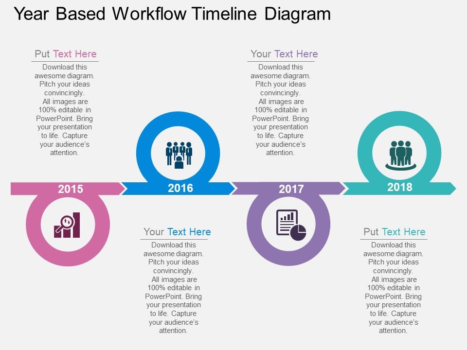 Year based workflow timeline diagram has been used to design this PowerPoint template. This diagram slide may be used to depict business steps with icons. Download this diagram for business research and analysis.