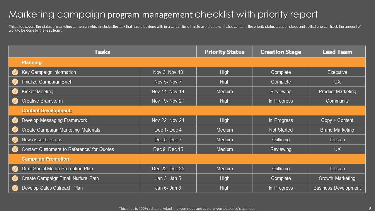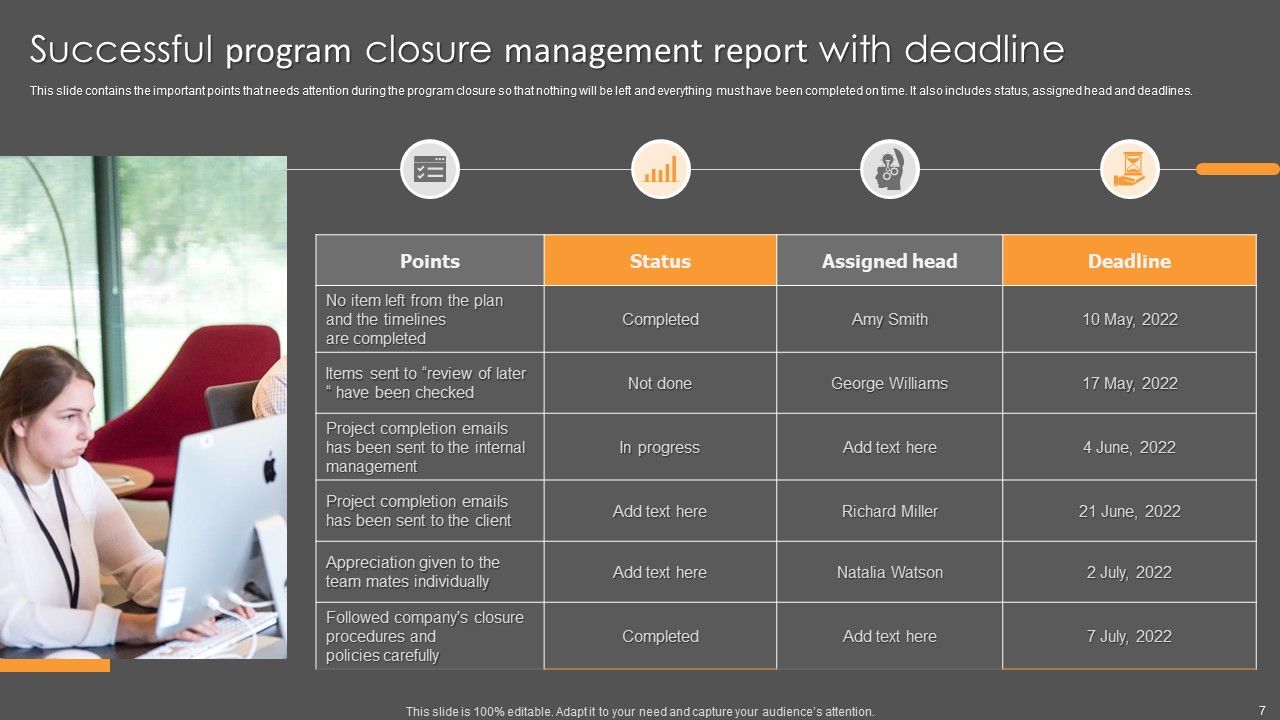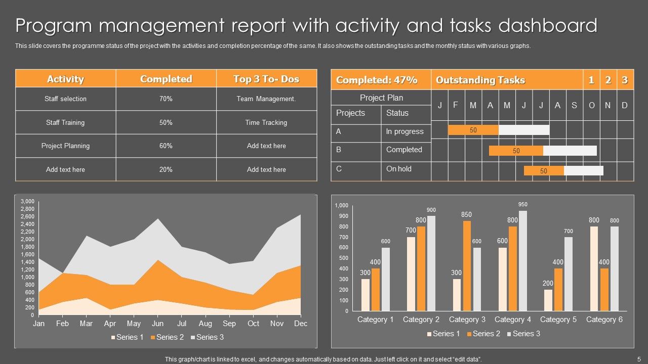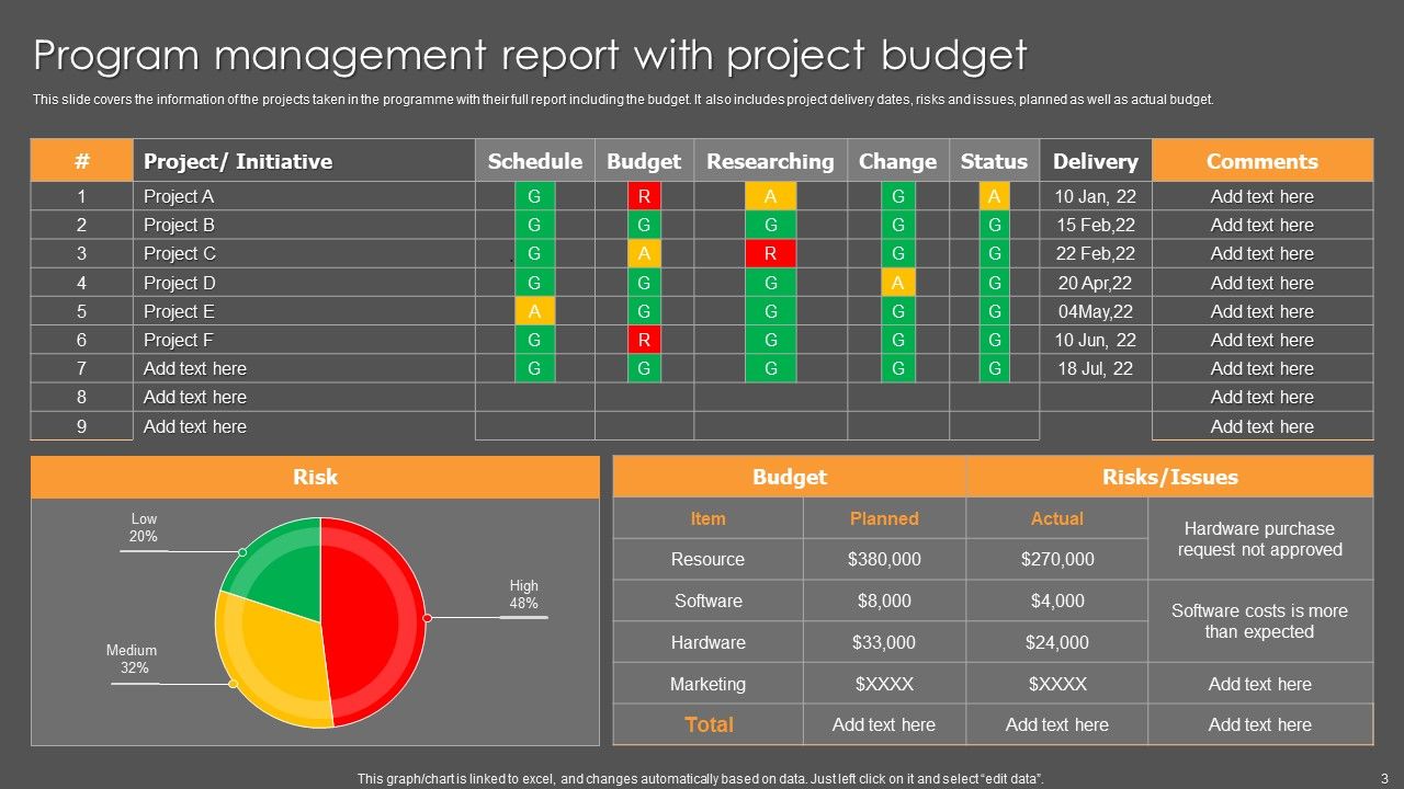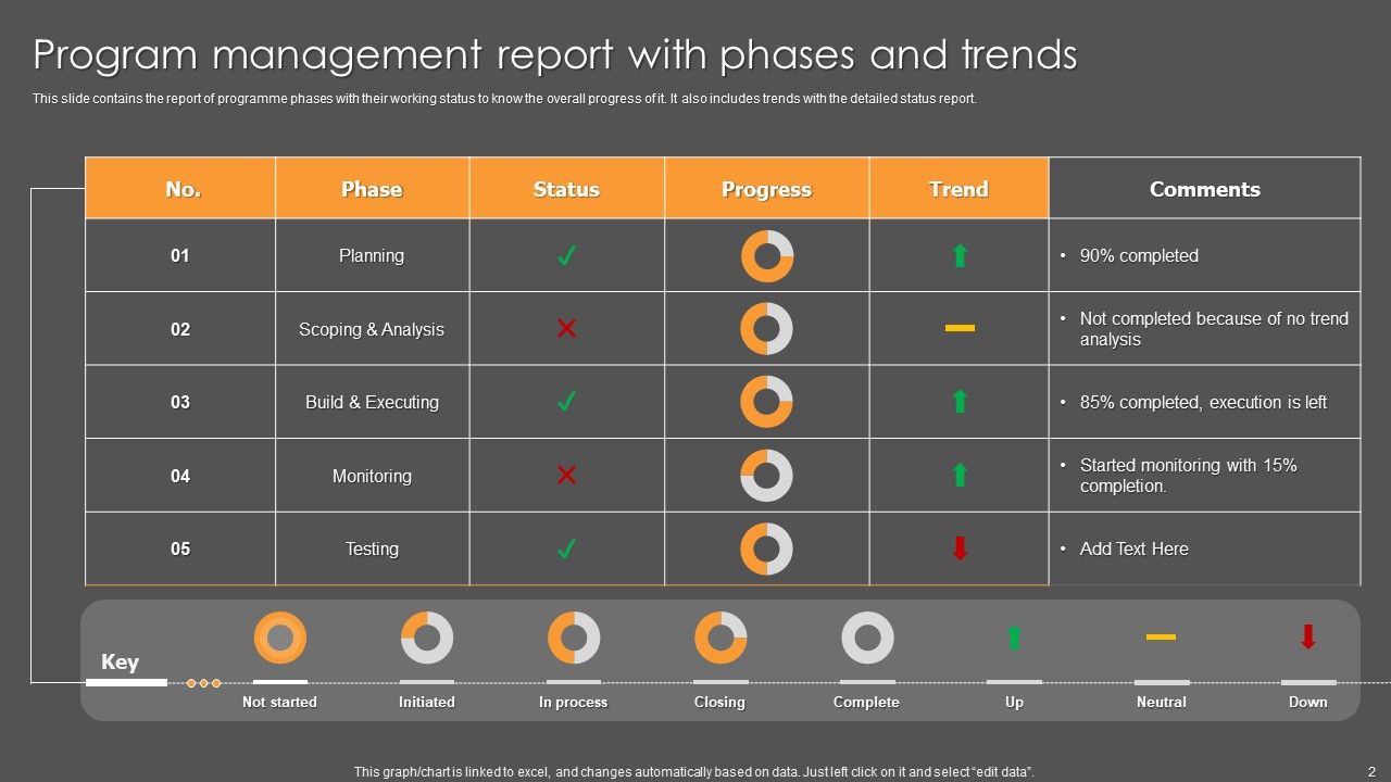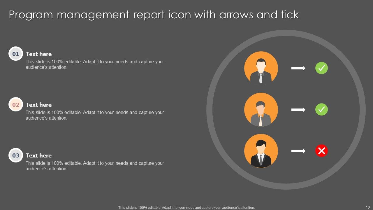 Share a great deal of information on the topic by deploying this Program Management Report Ppt PowerPoint Presentation Complete Deck With Slides. Support your ideas and thought process with this prefabricated set. It includes a set of twelve slides, all fully modifiable and editable. Each slide can be restructured and induced with the information and content of your choice. You can add or remove large content boxes as well, to make this PPT slideshow more personalized. Its high-quality graphics and visuals help in presenting a well-coordinated pitch. This PPT template is also a resourceful tool to take visual cues from and implement the best ideas to help your business grow and expand. The main attraction of this well-formulated deck is that everything is editable, giving you the freedom to adjust it to your liking and choice. Changes can be made in the background and theme as well to deliver an outstanding pitch. Therefore, click on the download button now to gain full access to this multifunctional set.