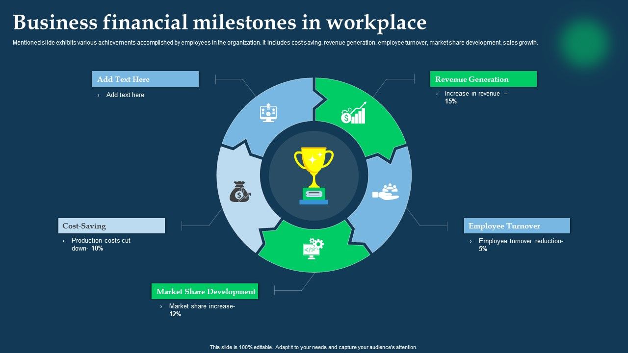Mentioned slide exhibits various achievements accomplished by employees in the organization. It includes cost saving, revenue generation, employee turnover, market share development, sales growth. Presenting Business Financial Milestones In Workplace Slides PDF to dispense important information. This template comprises five stages. It also presents valuable insights into the topics including Revenue Generation, Employee Turnover, Cost Saving. This is a completely customizable PowerPoint theme that can be put to use immediately. So, download it and address the topic impactfully.