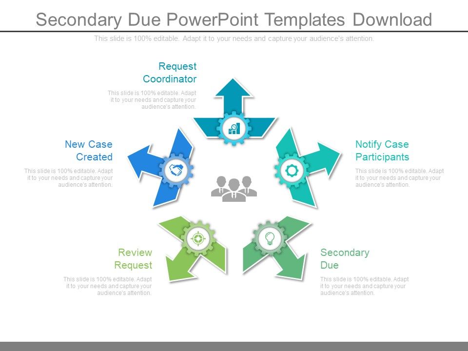 This is a secondary due powerpoint templates download. This is a five stage process. The stages in this process are request coordinator, new case created, review request, secondary due, notify case participants.