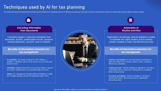 This slide showcases techniques that can help financial institutions or individual investors in effective tax planning. Techniques include Extracting information from documents and automation of routine activities. Are you searching for a Ways Artificial Intelligence Is Transforming Finance Sector Techniques Used By AI For Tax Planning Topics PDF that is uncluttered, straightforward, and original Its easy to edit, and you can change the colors to suit your personal or business branding. For a presentation that expresses how much effort you have put in, this template is ideal. With all of its features, including tables, diagrams, statistics, and lists, its perfect for a business plan presentation. Make your ideas more appealing with these professional slides. Download Ways Artificial Intelligence Is Transforming Finance Sector Techniques Used By AI For Tax Planning Topics PDF from Slidegeeks today.