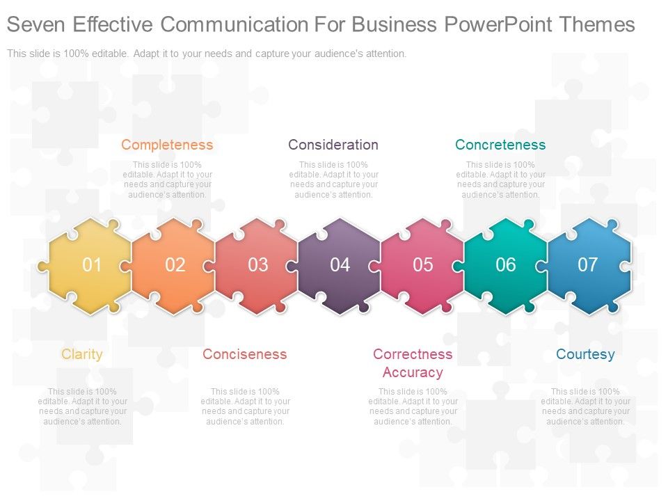 This is a seven effective communication for business powerpoint themes. This is a seven stage process. The stages in this process are completeness, consideration, concreteness, clarity, conciseness, correctness accuracy, courtesy.