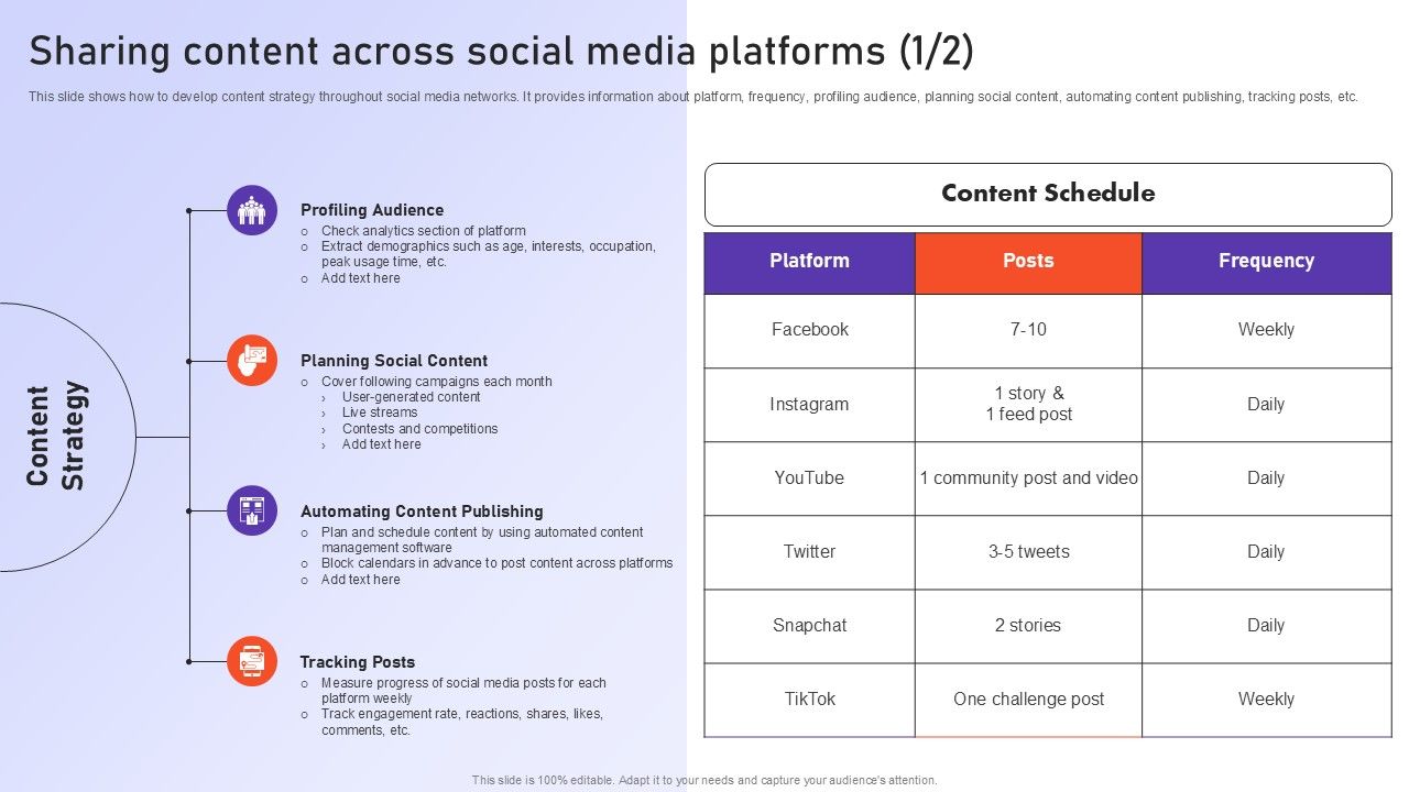 This slide shows how to develop content strategy throughout social media networks. It provides information about platform, frequency, profiling audience, planning social content, automating content publishing, tracking posts, etc. From laying roadmaps to briefing everything in detail, our templates are perfect for you. You can set the stage with your presentation slides. All you have to do is download these easy to edit and customizable templates. Sharing Content Across Social Media Platforms Ppt PowerPoint Presentation File Deck PDF will help you deliver an outstanding performance that everyone would remember and praise you for. Do download this presentation today.