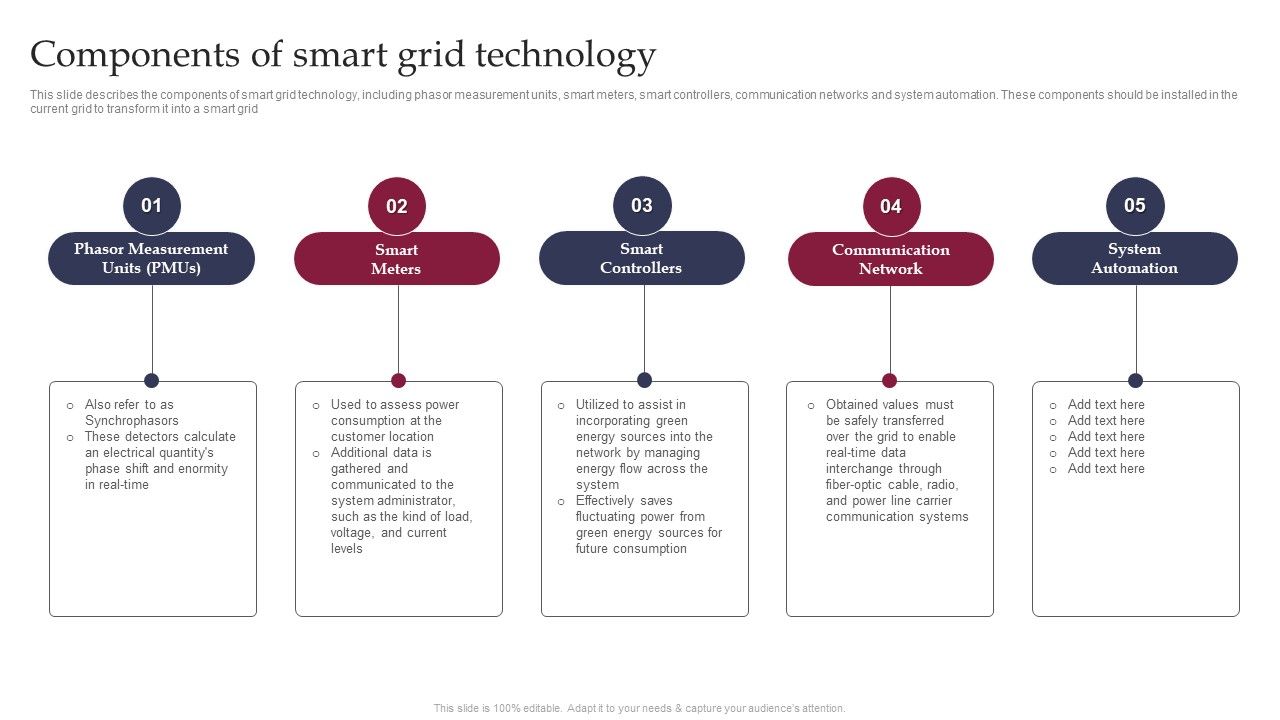 This slide describes the components of smart grid technology, including phasor measurement units, smart meters, smart controllers, communication networks and system automation. These components should be installed in the current grid to transform it into a smart grid If you are looking for a format to display your unique thoughts, then the professionally designed Smart Grid Technology Components Of Smart Grid Technology Rules PDF is the one for you. You can use it as a Google Slides template or a PowerPoint template. Incorporate impressive visuals, symbols, images, and other charts. Modify or reorganize the text boxes as you desire. Experiment with shade schemes and font pairings. Alter, share or cooperate with other people on your work. Download Smart Grid Technology Components Of Smart Grid Technology Rules PDF and find out how to give a successful presentation. Present a perfect display to your team and make your presentation unforgettable.