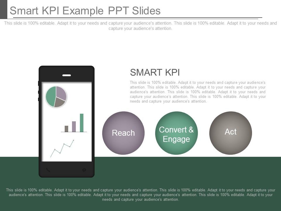 This is a smart kpi example ppt slides. This is a three stage process. The stages in this process are reach, convert and engage, act.