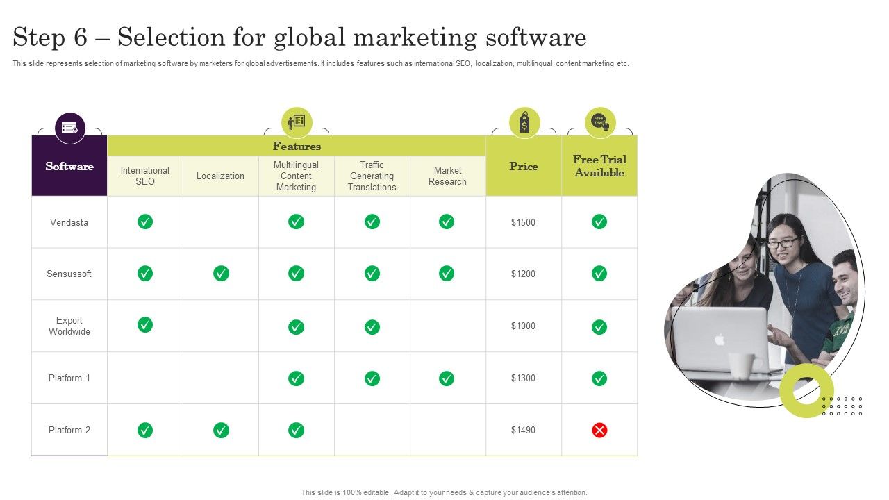 This slide represents selection of marketing software by marketers for global advertisements. It includes features such as international SEO, localization, multilingual content marketing etc. Slidegeeks is here to make your presentations a breeze with Step 6 Selection For Global Marketing Software Ppt Infographics Layouts PDF With our easy to use and customizable templates, you can focus on delivering your ideas rather than worrying about formatting. With a variety of designs to choose from, you are sure to find one that suits your needs. And with animations and unique photos, illustrations, and fonts, you can make your presentation pop. So whether you are giving a sales pitch or presenting to the board, make sure to check out Slidegeeks first.