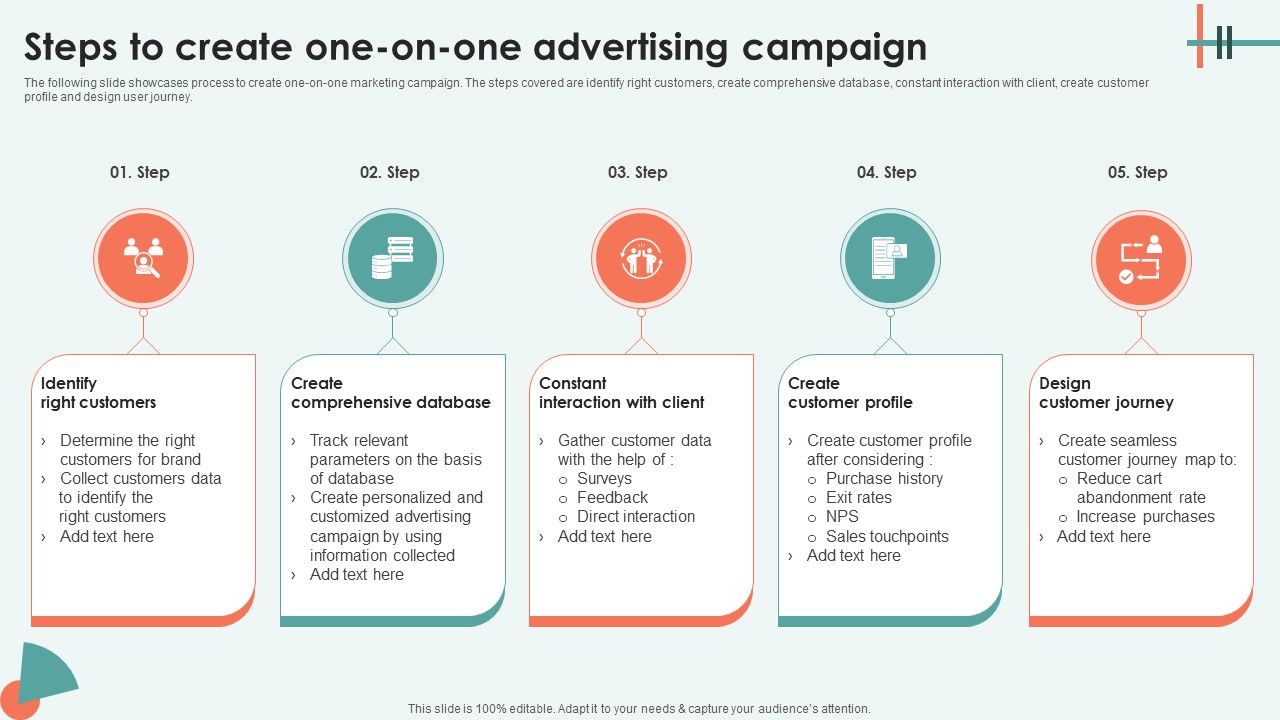 The following slide showcases process to create one on one marketing campaign. The steps covered are identify right customers, create comprehensive database, constant interaction with client, create customer profile and design user journey. Find highly impressive Steps To Create One On One Advertising Campaign Ppt Inspiration Guide PDF on Slidegeeks to deliver a meaningful presentation. You can save an ample amount of time using these presentation templates. No need to worry to prepare everything from scratch because Slidegeeks experts have already done a huge research and work for you. You need to download Steps To Create One On One Advertising Campaign Ppt Inspiration Guide PDF for your upcoming presentation. All the presentation templates are 100 percent editable and you can change the color and personalize the content accordingly. Download now.