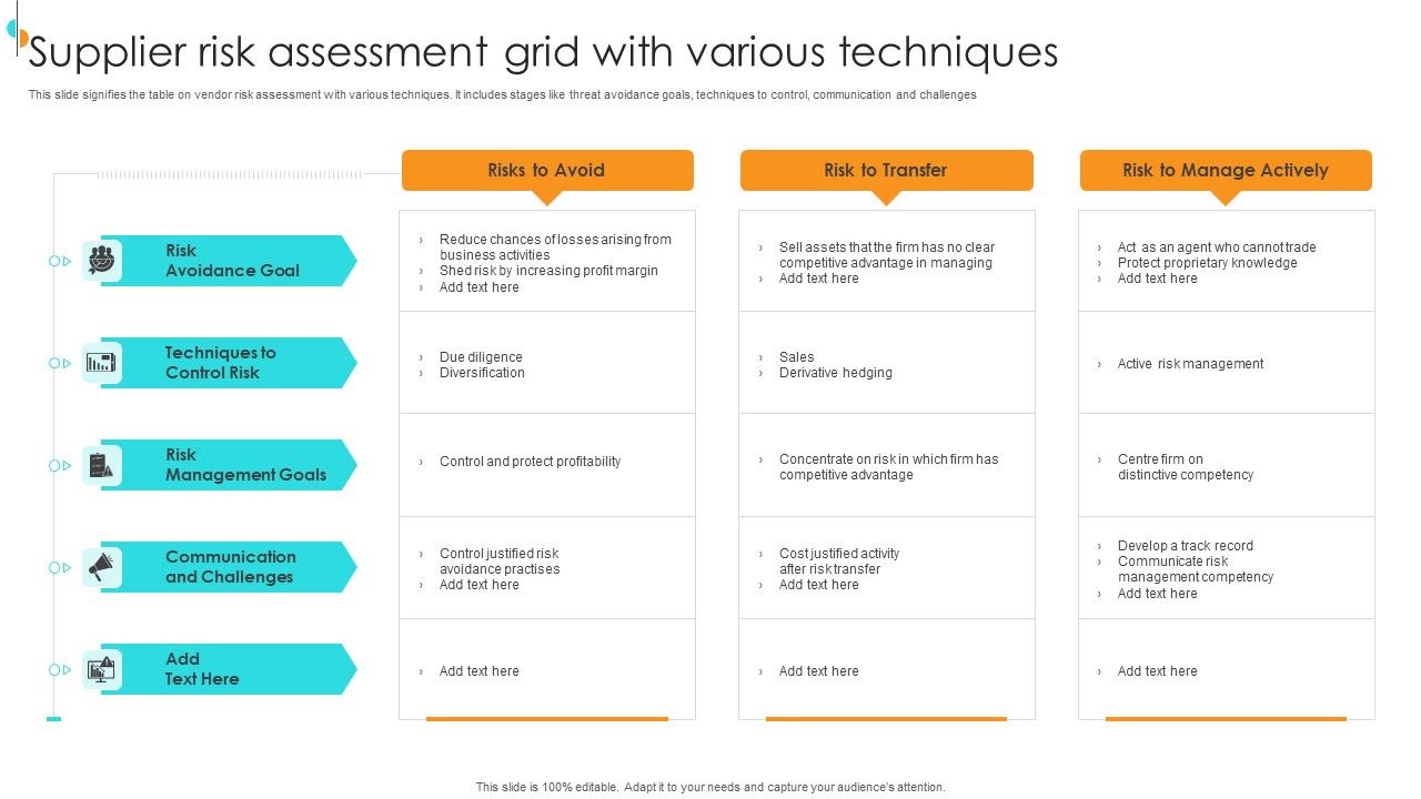 This slide signifies the table on vendor risk assessment with various techniques. It includes stages like threat avoidance goals, techniques to control, communication and challenges Pitch your topic with ease and precision using this Supplier Risk Assessment Grid With Various Techniques Rules PDF. This layout presents information on Control Risk, Management Goals, Challenges. It is also available for immediate download and adjustment. So, changes can be made in the color, design, graphics or any other component to create a unique layout.