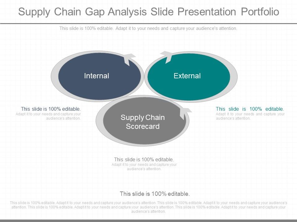 This is a supply chain gap analysis slide presentation portfolio. This is a three stage process. The stages in this process are internal, external, supply chain scorecard.