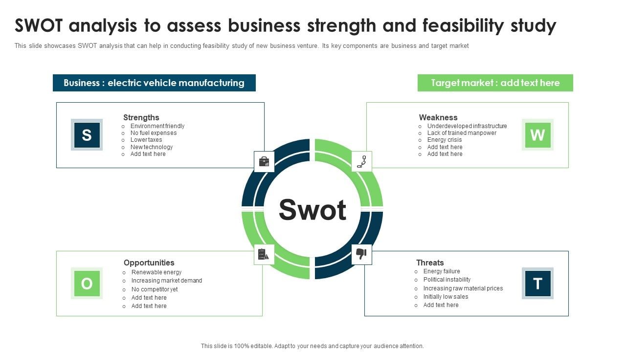 This slide showcases SWOT analysis that can help in conducting feasibility study of new business venture. Its key components are business and target market Pitch your topic with ease and precision using this SWOT Analysis To Assess Business Strength And Feasibility Study Microsoft PDF. This layout presents information on Opportunities, Threats, Study. It is also available for immediate download and adjustment. So, changes can be made in the color, design, graphics or any other component to create a unique layout.