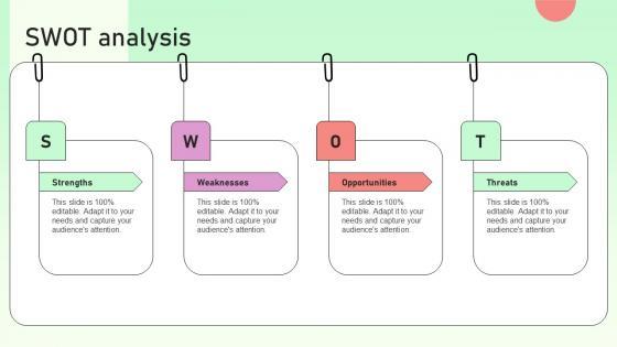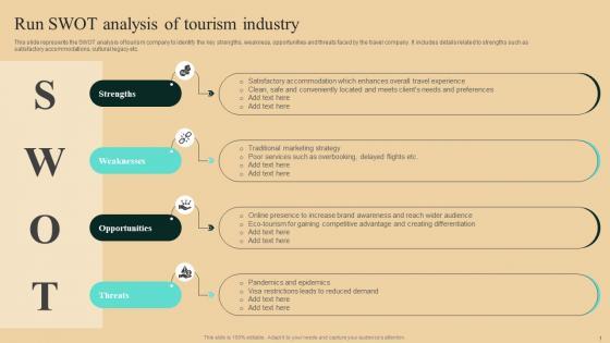 The purpose of this slide is to identify the industry strengths, weaknesses, opportunities, and threats related to the business. It guides the agency to build on what it does well, address what they are lacking, seize new openings, and minimize risks.Do you have to make sure that everyone on your team knows about any specific topic I yes, then you should give Comprehensive Swot Analysis Of Travel Agency Cultural Travel Agency Business Plan Guidelines Pdf a try. Our experts have put a lot of knowledge and effort into creating this impeccable Comprehensive Swot Analysis Of Travel Agency Cultural Travel Agency Business Plan Guidelines Pdf You can use this template for your upcoming presentations, as the slides are perfect to represent even the tiniest detail. You can download these templates from the Slidegeeks website and these are easy to edit. So grab these today.