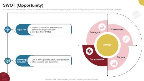 This slide showcase SWOT Strengths, Weaknesses, Opportunities and Threats analysis of Swiggy company that helps in converting company weakness into strengths and threats into opportunities . Find a pre-designed and impeccable Swot Opportunity Food Delivery Company Profile CP SS V. The templates can ace your presentation without additional effort. You can download these easy-to-edit presentation templates to make your presentation stand out from others. So, what are you waiting for Download the template from Slidegeeks today and give a unique touch to your presentation.