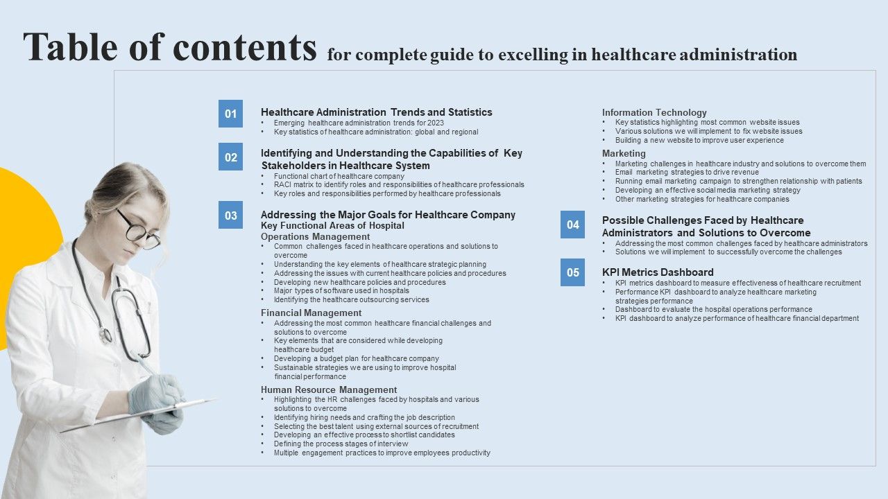 Table Of Contents For Complete Guide To Excelling In Healthcare Administration Pictures PDF with all 9 slides: