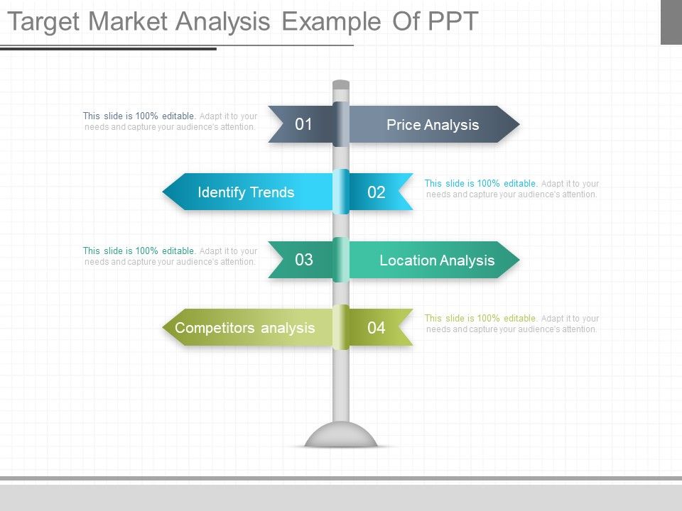 This is a target market analysis example of ppt. This is a four stage process. The stages in this process are price analysis, identify trends, location analysis, competitors analysis.